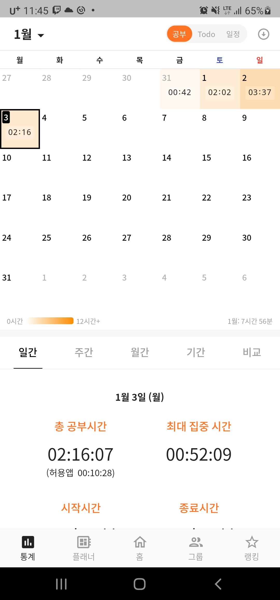 4. 일정표에 몇시간 공부를 했는지 나와 있습니다. 이걸로 언제언제 몇시간 공부를했는지 측정할수있어요