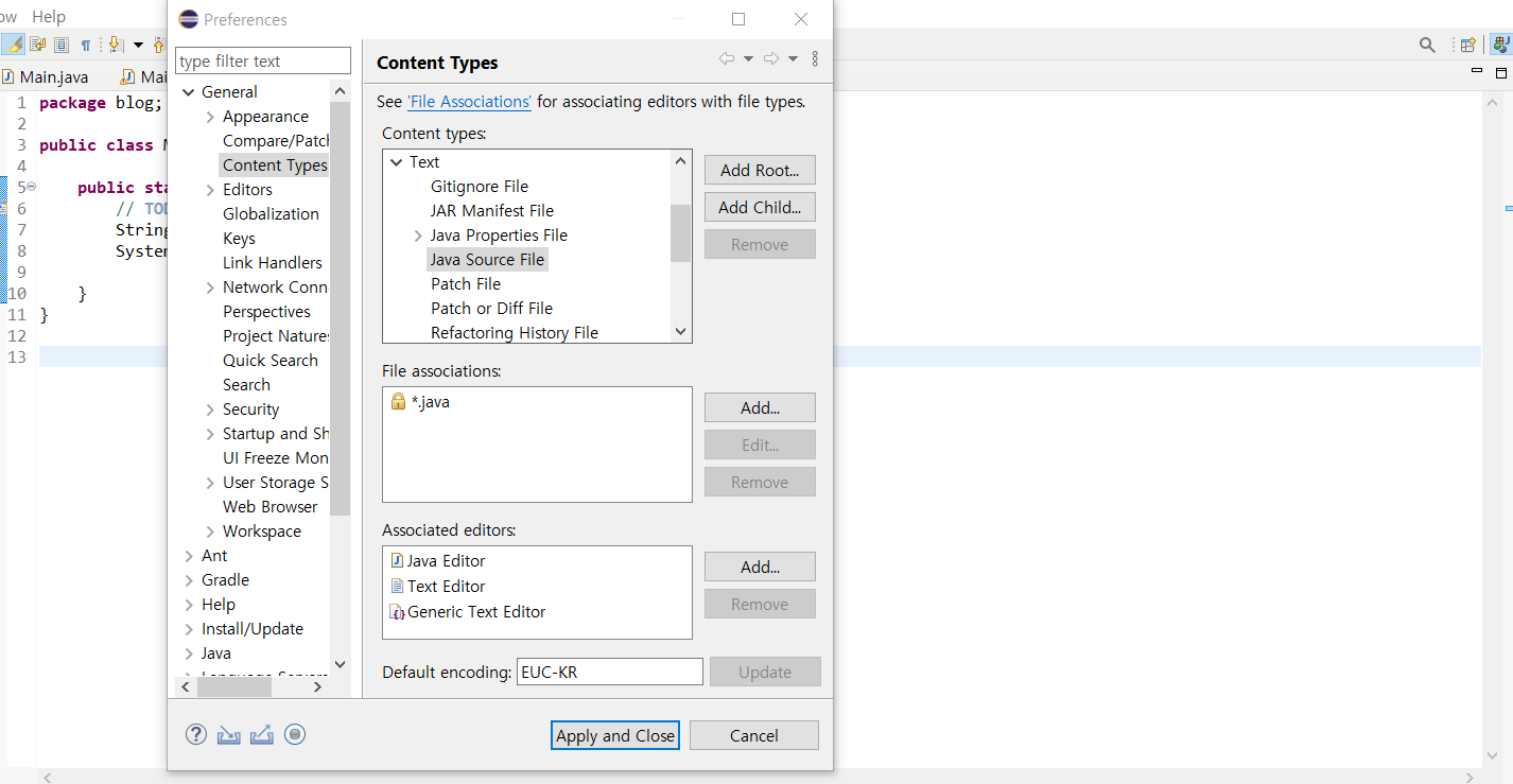 밑에 Default.encoding : EUC-KR로 해주시고 Updata 하고, Apply and Close를 누르시면됩니다.