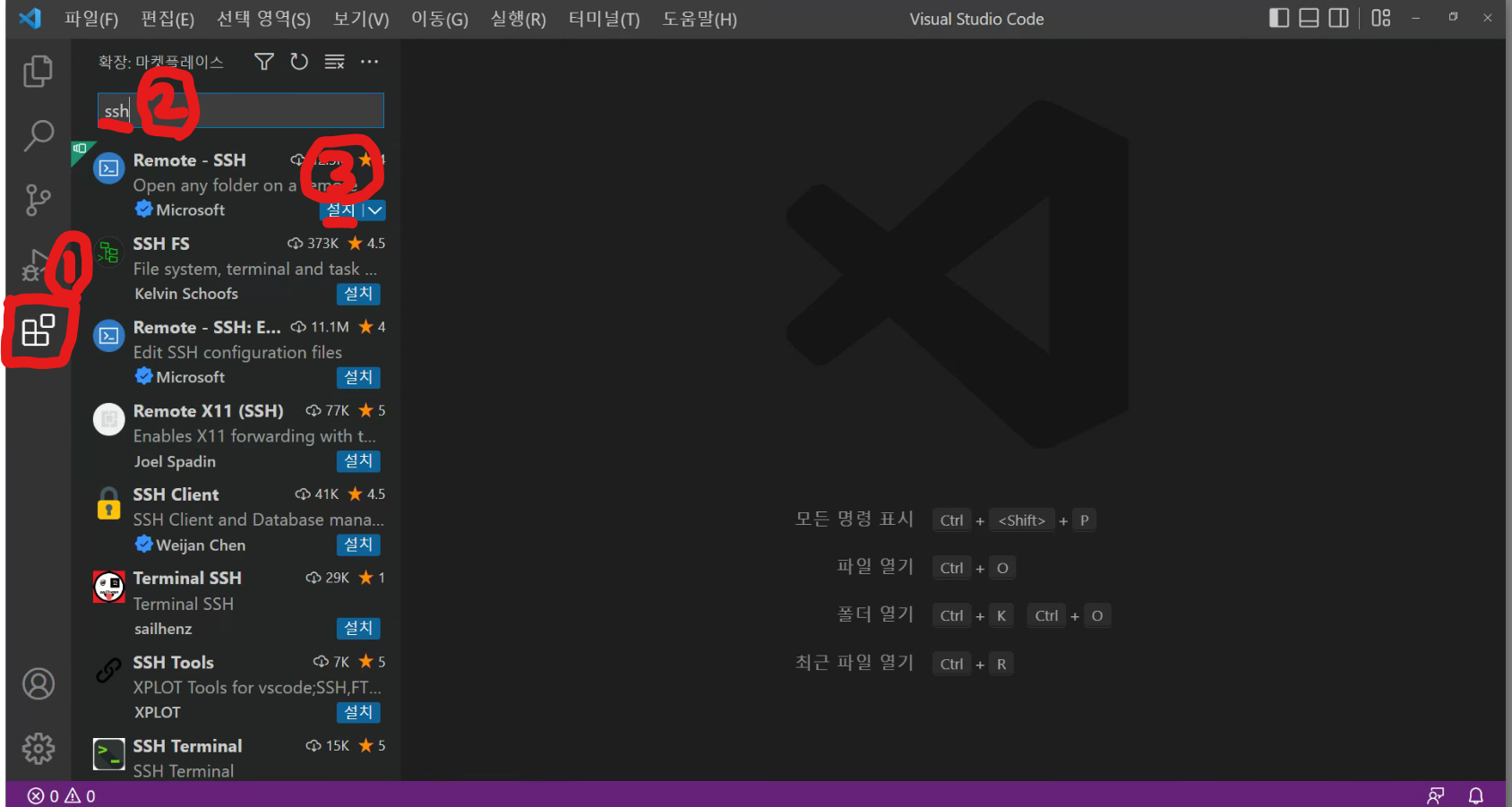 2. VScode를 실행 시키고 왼쪽 확장프로그램버튼과 ssh를 입력하셔서 Remote - SSH를 설치합니다.