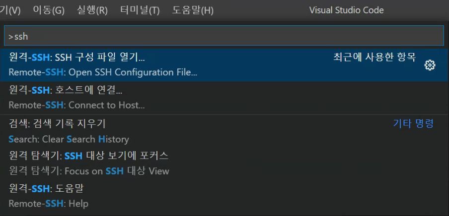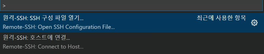 6.다시 F1을누르고 Reomte-SSH: Connect to Host를 클릭하셔서 입력한 번호를 찾아가 들어가서 비밀번호 입력후 들어가시면 됩니다.
