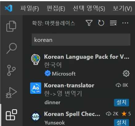 +저는 한국어로 써져있는데, 똑같이 따라하시려면 korean 확장 프로그램을 설치해주세요.