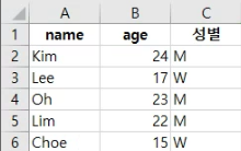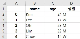 아까 결과에서 나온 A열에 있는 숫자를 Index라고 부르고, 'name', 'age' ,'성별' 은 column 이라고 부릅니다.